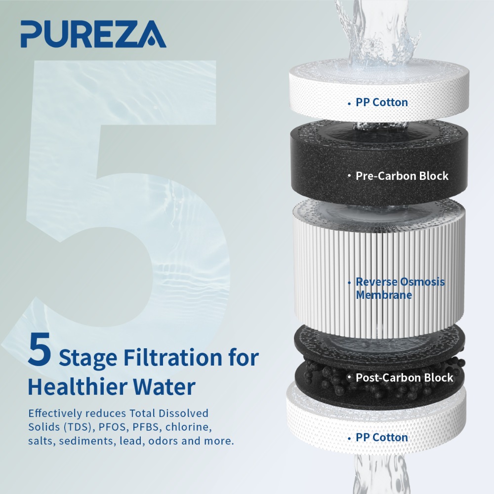 تتكون هذه الوحدة من قطن البولي بروبيلين، والكربون النشط، وغشاء التناضح العكسي، وطبقة إضافية من الكربون النشط. تُرشّح هذه الوحدة بفعالية المواد الصلبة الذائبة الكلية (TDS)، وPFOS، وPFBS، والكلور، والأملاح، والرواسب، والرصاص، والروائح، وغيرها. يضمن غشاء التناضح العكسي بسمك 0.00001 ميكرون مياه شرب آمنة ونظيفة.